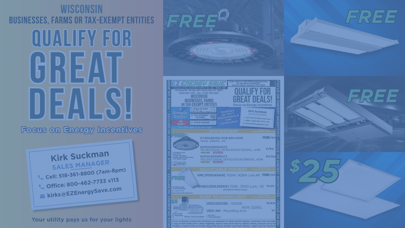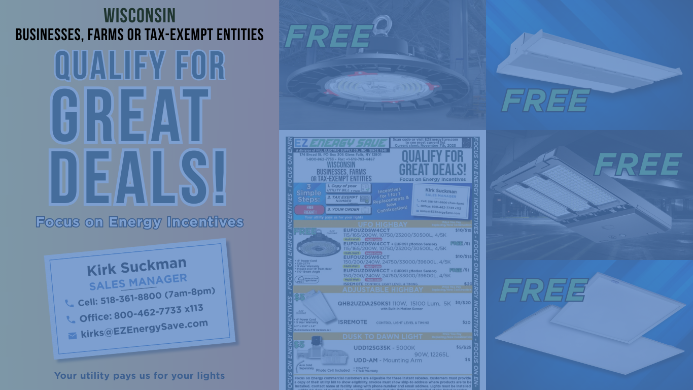 Through our partnership with Focus on Energy, we sell new LED lights at the lowest prices. We've helped hundreds of businesses, schools, municipalities, non-profits, and farms upgrade their lighting to LED across Wisconsin. New lights can be as low as FREE. You only pay the prices we quote you.